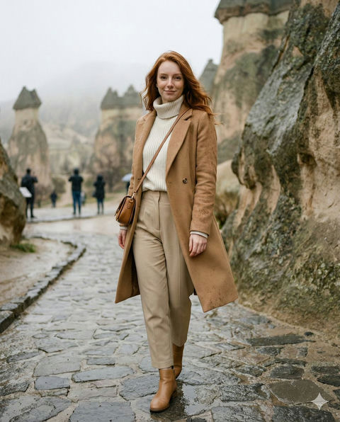 阴雨天卡帕多奇亚的时尚旅行博主大片