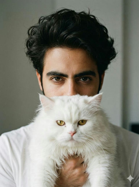 凌乱长发少年与波斯猫的温柔遮面