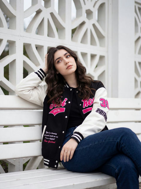 白色几何格栅前的休闲街头风少女