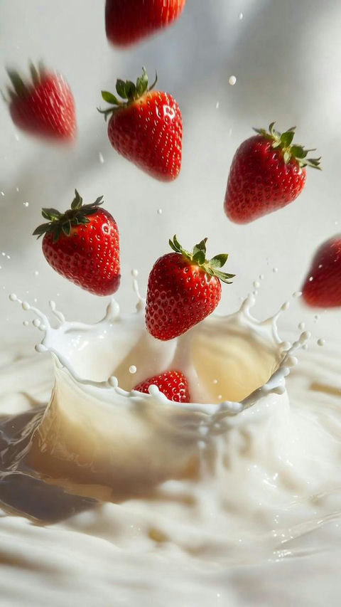 极致微距下的鲜红草莓坠入丝滑牛奶