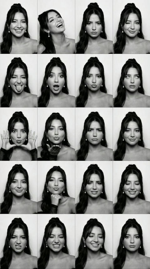 "interaction": "与镜头反射进行眼神接触,中性嘟嘴的面部表情",