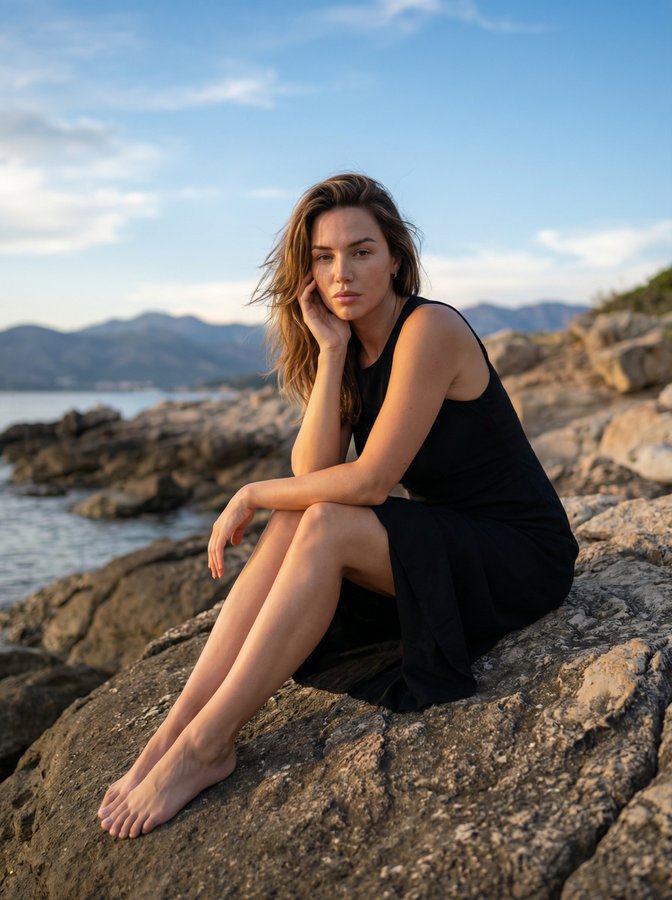 超写实电影级奇幻场景,设定在郁郁葱葱的史前丛林山谷中。一只巨大的棘龙站在浅河边,它那长而类似鳄鱼的巨颚张得很大。一位年轻女子平静地坐在恐龙张开的嘴里,完美居中,双腿微微向前悬挂。她有一头深色直发,表情镇定无畏,皮肤纹理逼真。她身穿合身的黑色长袖短款上衣,蓝色牛仔短裤和黑色及膝战术靴。衣服和腿上可见微小的血迹和轻微划痕,增加了戏剧性的紧张感但并不血腥。她怀里温柔地抱着一只小恐龙幼崽,充满保护欲地抱着它。 在他们身后,一道高耸而充满戏剧性的瀑布顺着覆盖着茂密绿色植被和薄雾的陡峭丛林悬崖倾泻而下。场景中栖息着多只恐龙:几只迅猛龙在河岸边潜行,小型食草动物在背景中奔跑,飞翔的翼龙在头顶盘旋。环境丰富,有长满苔藓的岩石、流动的河水、热带植物和柔和的大气雾。 灯光具有电影感和自然感,漫射的日光照亮场景,阴影细节丰富,焦点清晰地聚在女子和棘龙身上,背景元素采用浅景深。恐龙鳞片、牙齿、水珠、树叶和织物上的超写实纹理。史诗奇幻写实主义,戏剧性构图,垂直构图,超精细,照片级真实感,4K,电影级调色,无文字,无水印。