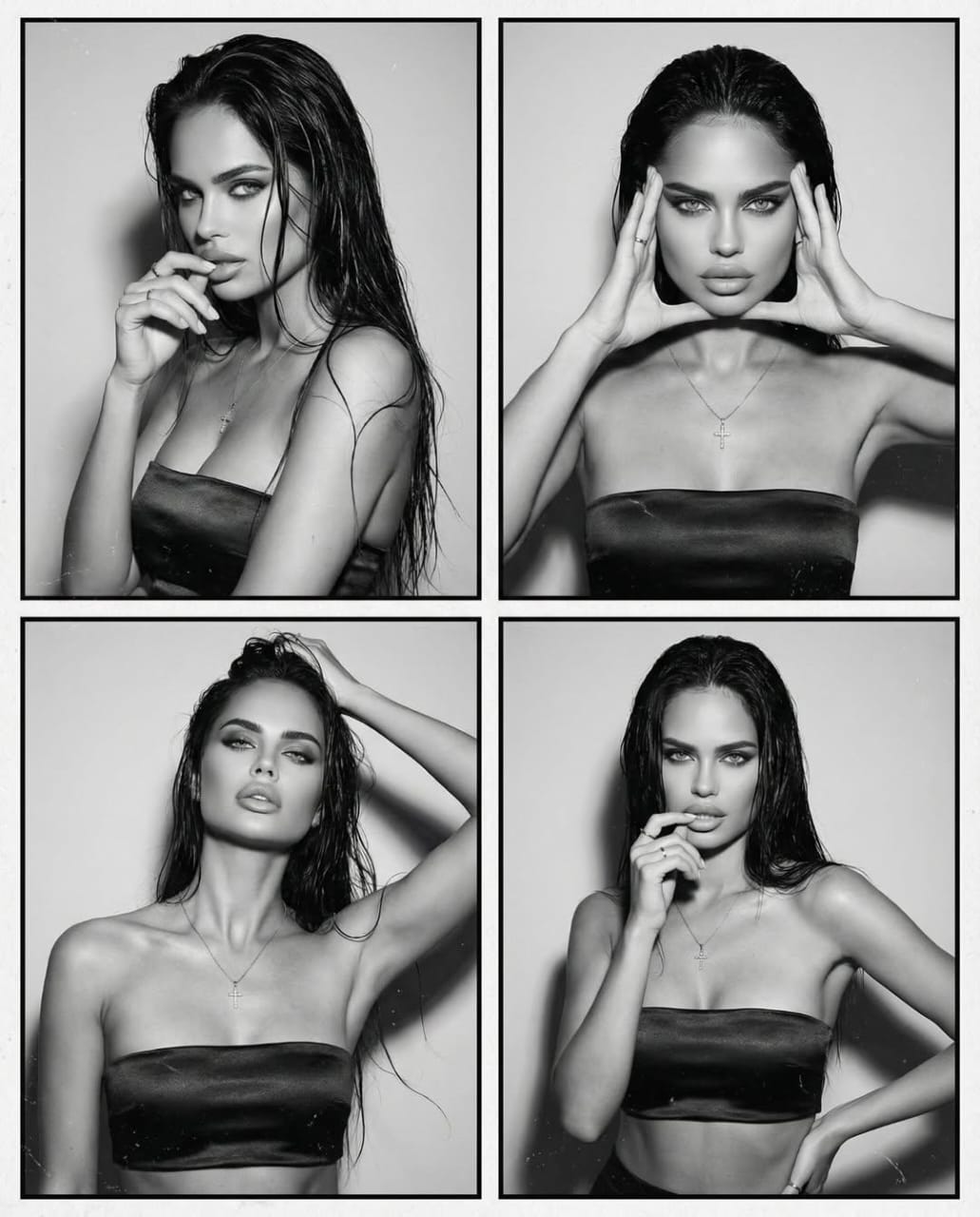 { "image_type": "photograph", "genre": "lifestyle portrait with animal", "composition": { "framing": "vertical portrait orientation", "shot_type": "medium close-up selfie-style composition", "camera_angle": "slightly elevated arm-length angle", "subject_positioning": "human subject on right third, horse head occupying left third, faces close and parallel", "depth_of_field": "moderate, subjects sharp with softly blurred background", "balance": "asymmetrical balance between human face and horse head" }, "subjects": [ { "type": "human", "description": "young woman", "pose": "standing beside horse, leaning head gently toward horse", "expression": "soft smile, relaxed and confident", "gaze": "directly toward camera", "hair": { "color": "dark brown/black", "style": "pulled back into a low bun or ponytail", "texture": "smooth" }, "makeup": { "style": "polished natural glam", "details": "defined eyebrows, subtle eyeshadow, eyeliner, rosy blush, pink lipstick" }, "accessories": [ "gold statement earrings" ], "clothing": { "type": "long-sleeve wrap-style dress", "pattern": "abstract zebra-like stripes", "colors": [ "white", "royal blue" ], "fabric": "lightweight flowing fabric" } }, { "type": "animal", "species": "horse", "coat_color": "dark brown", "markings": "small white star on forehead", "tack": { "bridle": "dark leather bridle with metal fittings", "reins": "black reins held by human subject" }, "pose": "standing calmly, head slightly lowered" } ], "environment": { "setting": "outdoor natural landscape", "location_type": "countryside or mountainous area", "background_elements": [ "green grass", "trees", "rocky mountain formation", "blue sky with scattered clouds" ], "season": "spring or summer" }, "lighting": { "type": "natural daylight", "direction": "front-left sunlight", "quality": "soft yet bright", "shadows": "gentle shadows under chin and along horse’s contours", "overall_exposure": "well-exposed with vibrant highlights" }, "color_palette": { "dominant_colors": [ "blue", "white", "green", "brown" ], "tone": "fresh, vibrant, natural", "contrast": "moderate", "saturation": "medium-high" }, "technical_details": { "camera_type": "smartphone or mirrorless camera", "lens_equivalent": "wide to standard (approximately 24–35mm)", "focus": "face-detection focus on human subject", "image_clarity": "high resolution, sharp details", "noise": "minimal" }, "artistic_style": { "aesthetic": "luxury lifestyle meets nature", "mood": "serene, elegant, intimate", "influences": [ "fashion editorial", "travel lifestyle photography" ] }, "post_processing": { "retouching": "light skin smoothing and color correction", "color_grading": "cool blues balanced with warm skin tones", "sharpening": "moderate, focused on faces" }, "background_blur": { "type": "natural depth-of-field blur", "intensity": "subtle" }, "overall_description": "An elegant outdoor lifestyle portrait capturing a stylish woman and her horse in a sunlit natural setting, b"